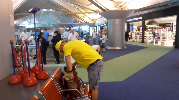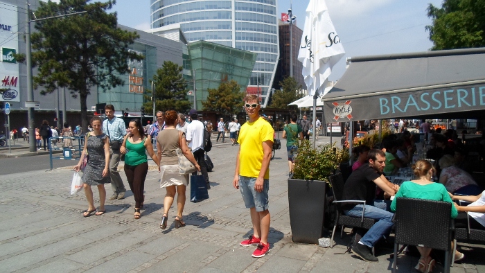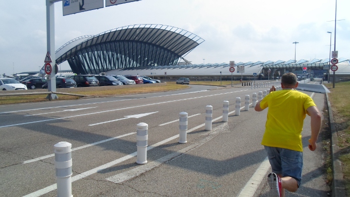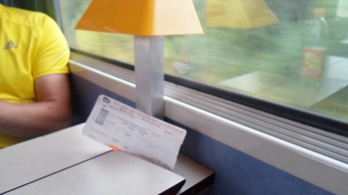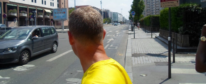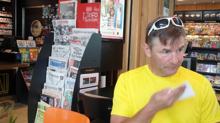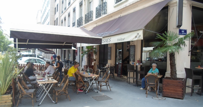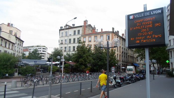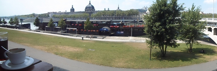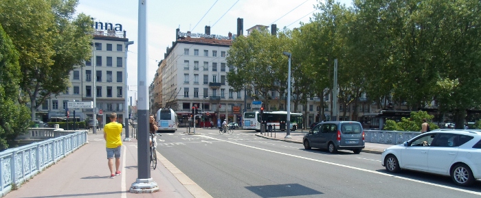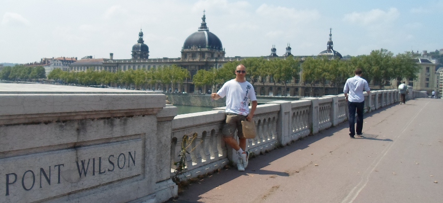 Starten går på flygplatsen utanför Lyon, närmare bestämt från hotell Kyriad. Här ses jerseyn sätta av i hisnande fart och i stor stil.Efter att ha tagit fel i ett kryss hamnade vi på omvägar i Macon med tåget mot Paris. Kan ses som ett cykelhaveri i samma stil som för ryttarna på Touren. Man byter cykel och tar fart, lägger sig bakom en följebil eller får ner en hjälpryttare. I vårt fall fick det gå med hjälp av vänlig franssyska och annat mera.Här ses gul tröja torka smulorna efter ypperlig sockerbakelse med chocklad av en art man inte finner hemma. Kaffe följde med ner i gapet. Fotografen nöjde sig med okultiverad glass i strut. I bakgrunden tidningsrubrikerna om gårdagens etappsegrare Riblon. Vi var där när det hände. Rycket, just där vi stod på Alpe d` Huez.Äntligen på rätt tåg. Rhônedalen passerar revy samtidigt som klockan tickar och tåget rusar mot vår destination. Den gula tröjan dock fortfarande i täten.Så framme. Hett. Obönhörlig värme. Vart är nu floden? Kartan och flinande Lyonbo visar vägen. Vacker stad och SAS skrapan tornar upp som känt landmärke bakom där en plats.På språng, eller, fort i alla fall, genom byn längs Cours Lafayette. Håll rygg på gult.Vacker bro, Pont Wilson och i bakgrunden gamlebyn. Romantiskt tyckte vi när ett par kom gående hand i hand och passande ett franskt vykort.Framme vid floden. Mycket vackert. Gamlebyn ses i bakgrunden och upp mot höjden i blickfånget till den gula tröjan. Vi ser möjligheter till goda cykelturer längs vattnet och drömmer om framtida besök. Pittoreskt cafe längs strandbädden och veckans bästa cappuchino säger fotografen.Fantastiskt ställe längs boulevarden. Franskt så det förslår. En gumma stånkade sig ner vid ett bord och beställde in en giftgrön drink innan hon vaggade vidare ut i världen. Här ses den gula tröjan vänta böjd över bordet i stilla andakt.Här ses ett torg med uteserveringar och längs trottoaren står motorcyklar, vespor och mopeder. Man skulle vara här en sommar och flänga runt på en sådan där vespa och låta sig fläktas medans man förtjänade sitt bröd på något lystigt och lätt och ha cykeln med sig för träning i området. Alperna är ju inte långt bort heller.Är det alperna där tycks den gula tröjan tänka längtansfullt medans han väntar i ett kryss. Trafikerat blir det i stora städer. Tuut tut!Framme vid terminalen. Nu är det bara att hänga på genom och ut till flygbussen. Här myllrar det av folk och och folkslagets kännetecken och egenkaraktär gör sig gällande i allt från klädstil till smak samt näsor och gång, för att inte tala om språket. Dock vid stora terminaler talar man stolt en god del engelska, ovanligt i övrigt.Pickeli pack och smälta intryck. Hvilken resa!. Hit kommer jag gärna igen. Bli med ner till de stora fjällsetapperna nästa år igen och uppleva en liknande storslagenhet och samma cykeläventyr!
